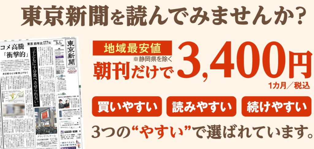 コーヒー1杯ほどの価格で、毎日あなたのもとに届く確かな情報。家計にやさしく、読みごたえのある新聞です。毎朝のひとときに、東京新聞をどうぞ。